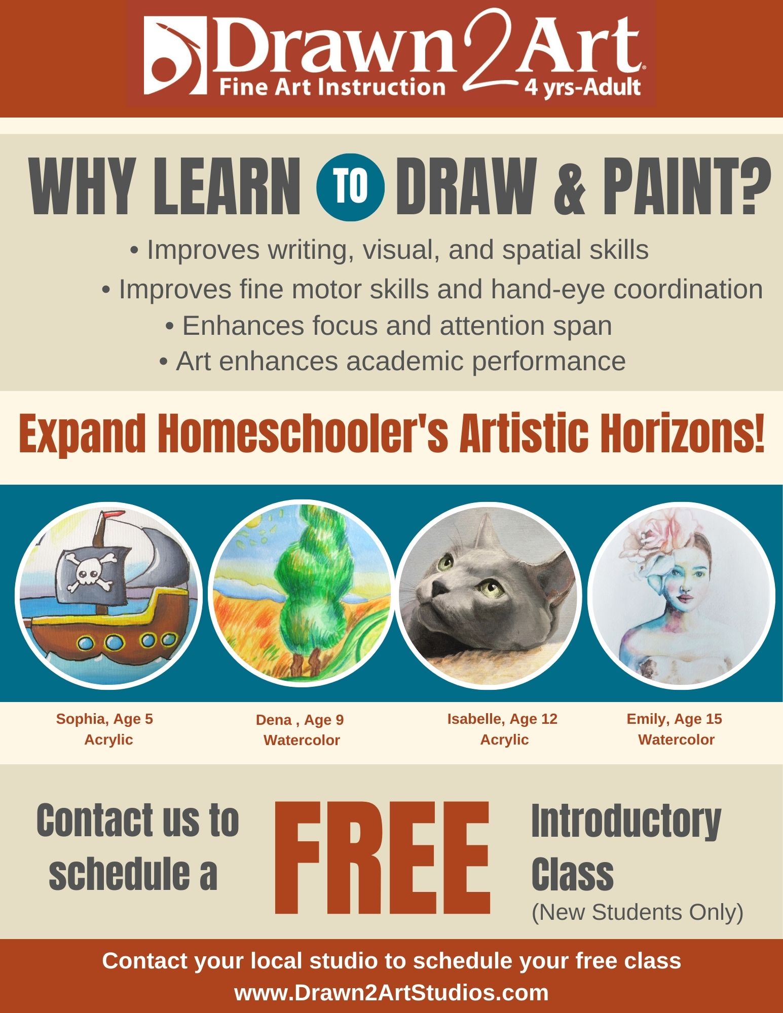 Drawn2Art’s philosophy is “creativity follows mastery,” and that a strong foundation of artistic skills will enable students to eventually follow any artistic path they choose. In the same way that the great Masters became proficient in classical drawing and painting first, so do our students. Instruction, coupled with practice, will bring about an independent and confident artist.